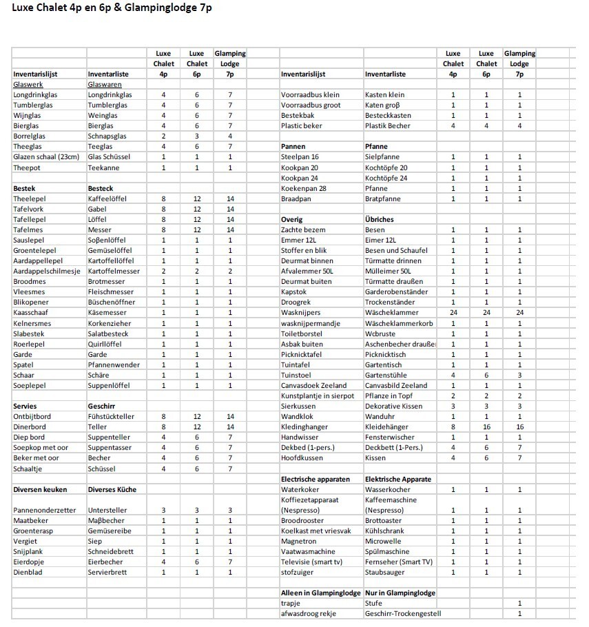 Die Glampinglodge (5,4 x 9 Meter) für bis zu 7 Personen verfügt über ein Wohn-/Esszimmer mit Gerüstholzmöbeln, Flachbildfernseher, privatem WiFi-Modem, Luftheizung und einer offenen Küche. Die Küche ist mit einem Kühlschrank mit Gefrierfach, einem Kochfeld, einer Mikrowelle, einem Geschirrspüler, einer Nespresso-Kaffeemaschine und einem Wasserkocher ausgestattet.