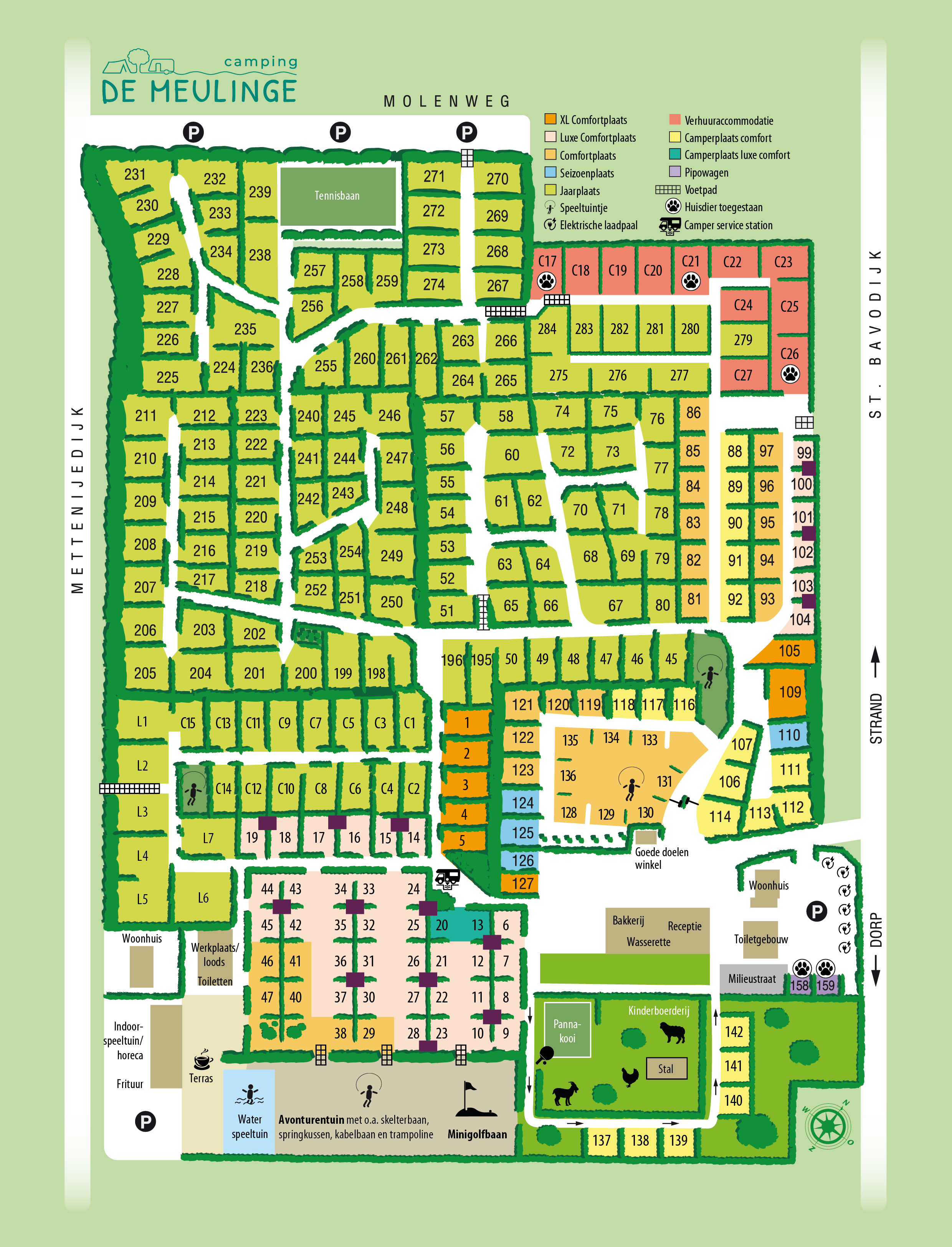Hierboven vind je de plattegrond van de camping. Rechtsboven in de plattegrond vind je de legenda, hierin staat aangegeven welke kleur hoort bij welke soort campingplaats.
