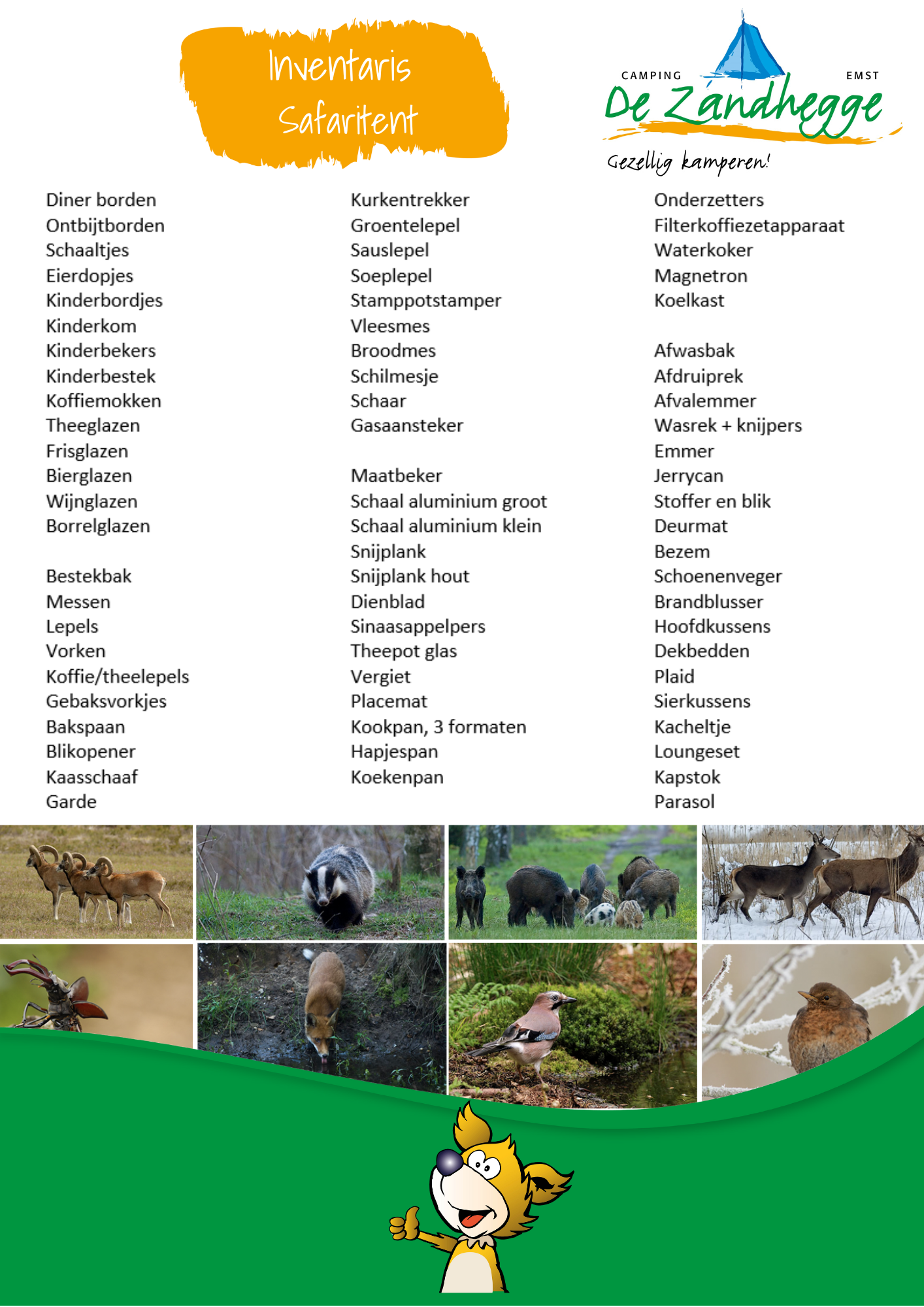 Deze prachtige safaritenten bieden ruimte aan 4 personen, 1 x een 2 persoonsbed en een stapelbed. De tenten zijn volledig, maar simpel ingericht. Op de veranda staat een heerlijke loungebank waarop je heerlijk kan ontspannen tewijl je naar de kinderen kijkt die op het sportveld aan het spelen zijn. Deze safaritent is voorzien van een keukentje waar jezelf heerlijk in kunt koken. WC en douche in het dichtbij gelegen sanitairgebouw. Dekbedden en kussens aanwezig. Het afnemen van linnenpakketten is verplicht. In het vroege voorseizoen en naseizoen kan het fris zijn in de tent.